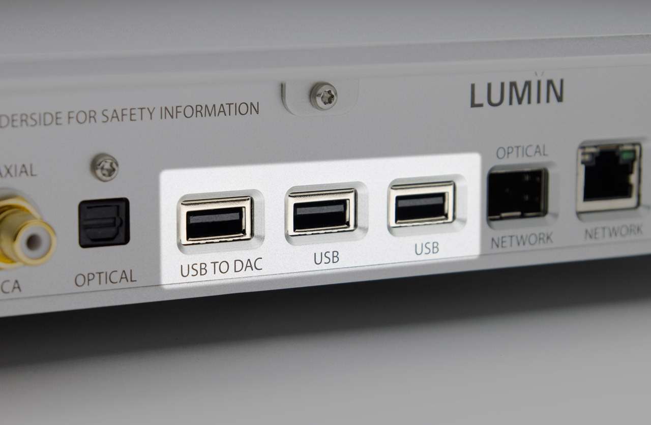 Lumin U2 oferuje aż trzy porty USB, z czego jeden – Direct-Coupled – został zaprojektowany specjalnie dla cyfrowego wyjścia audio o niskim poziomie szumów. Pozostałe dwa mogą służyć do przechowywania muzyki lub podłączania akcesoriów, zwiększając funkcjonalność urządzenia.