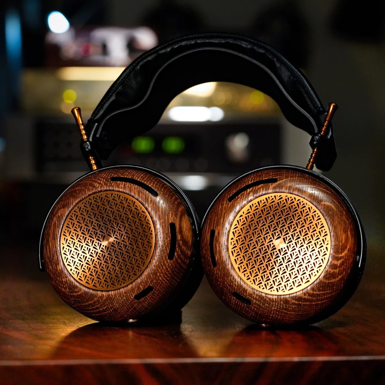 ZMF Caldera to nie tylko technologia – to także prawdziwe dzieło rzemiosła. Obudowy wykonywane są ręcznie z białego dębu amerykańskiego, którego naturalna struktura została podkreślona złotym lakierem coffee gold. Złote grille i prowadnice dodają całości elegancji, a solidny, czarny pałąk z aluminium, wykończony naturalną skórą i miękką pianką, zapewnia wygodę i doskonałe dopasowanie.